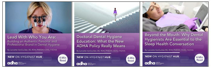 Hygienist Hub is ADHA’s resource for short articles on clinical updates, career strategies, highlights & can’t-miss stories. To access any of the following topics, visit www.adha.org/hygienist-hub/.