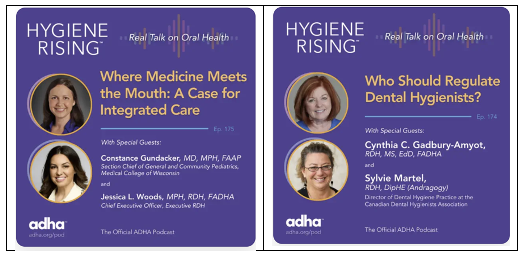 Hygiene Rising: Real Talk on Oral Health is the official podcast for the ADHA. Join us as we discuss relevant thoughts, ideas, & best practices for dental hygienists throughout the United States. Be sure to reach out with ideas for our show on any of ADHA’S social media channels. Former ADHA President Matt Crespin, MPH, RDH, FADHA is the host for these podcasts. To access these topics, visit Hygiene Rising - Podcast - Apple Podcasts