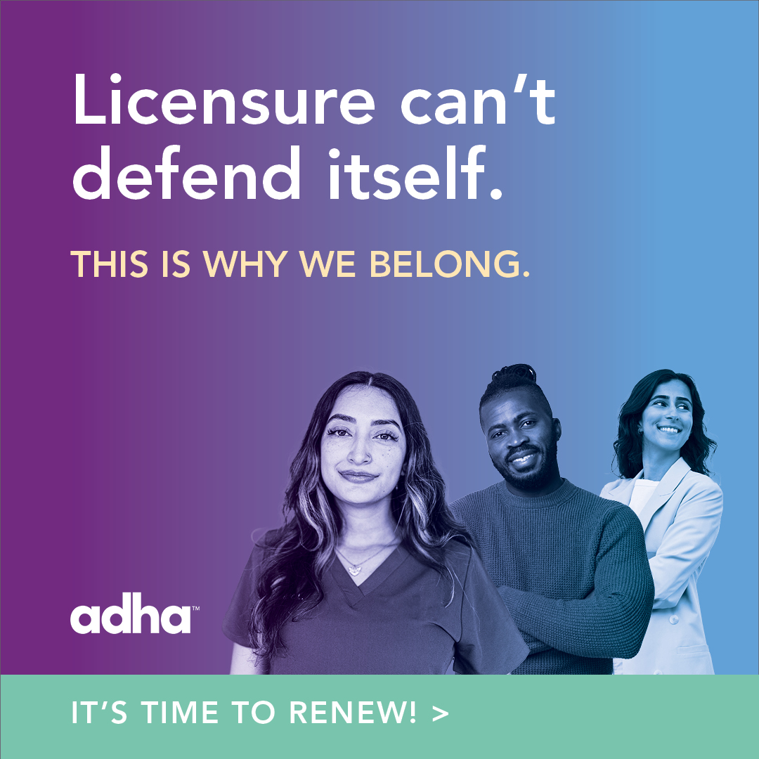 The ADHA is working to protect licensure, advance license portability, expand access to care, and put patient safety first. These advocacy wins don’t happen on their own. Your membership makes advocacy possible. Renew your membership today to keep your profession strong.